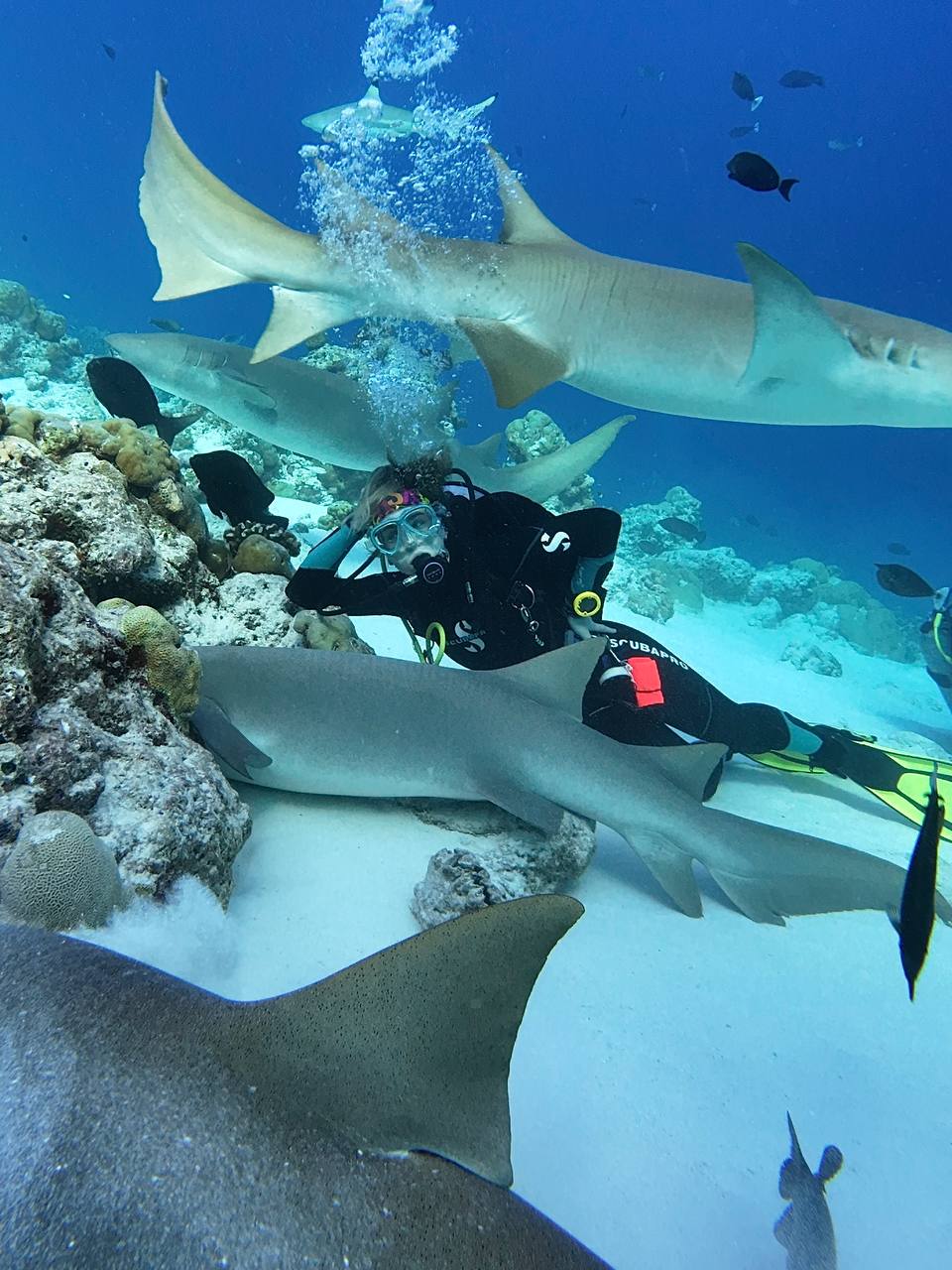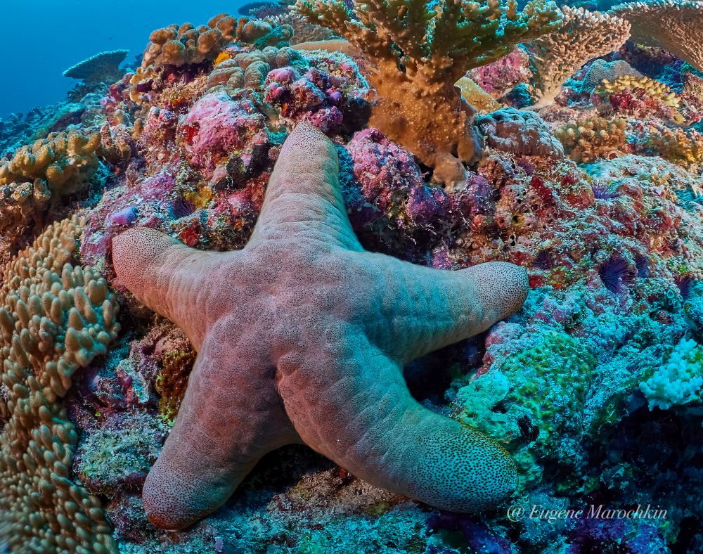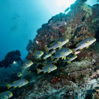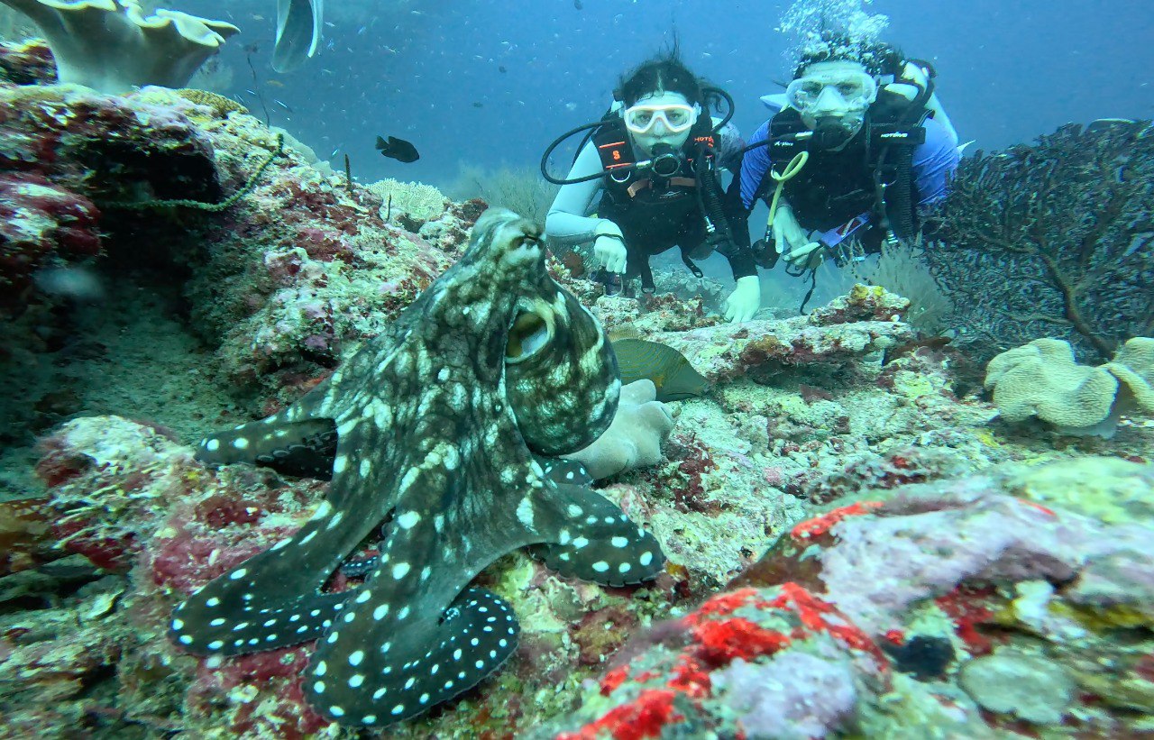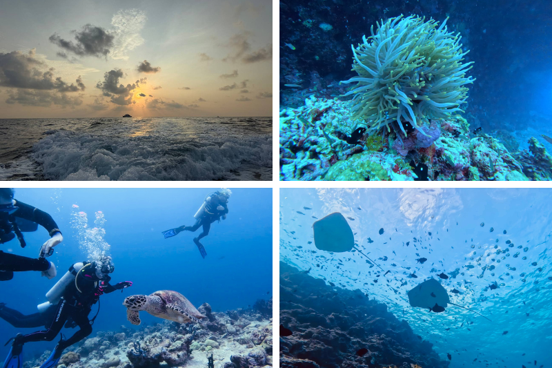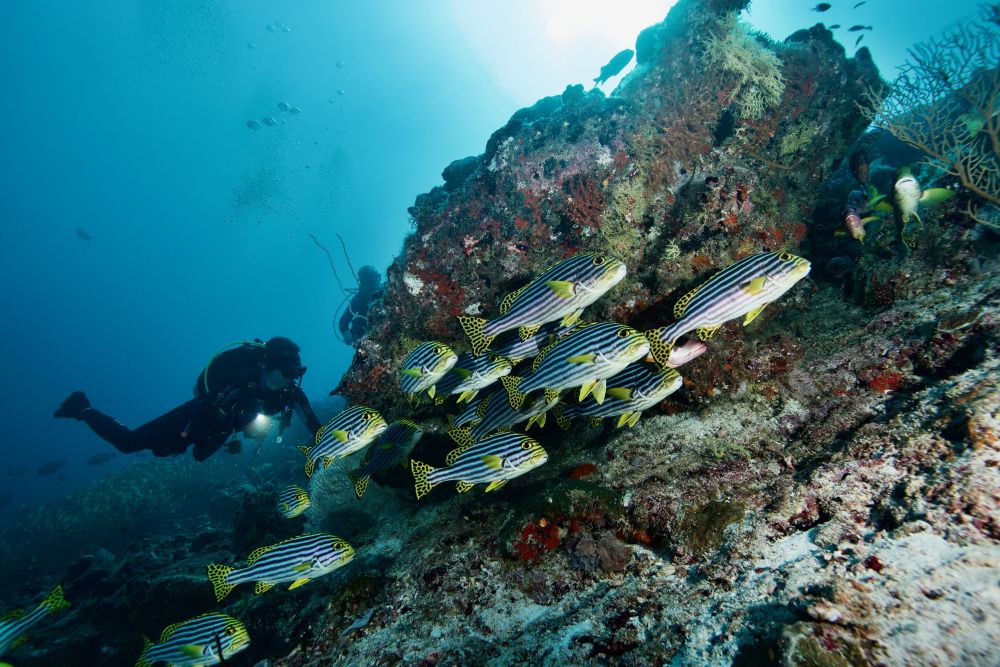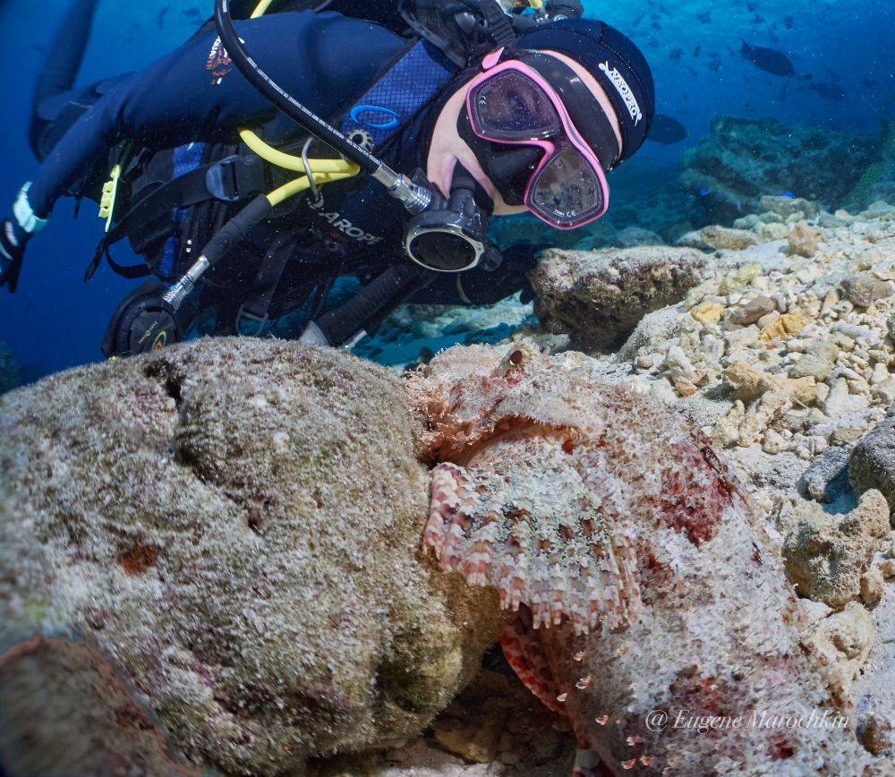 Подводный рельеф меняется при каждом новом погружении - это и погружения на подводных рифовых вершинах, и в каналах, ведущих из океана внутрь атолла, а также у вертикальных рифовых стен, покрытых актиниями и живописными мягкими кораллами. Традиционны встречи с китовыми акулами, акулами-няньками, серыми рифовыми.